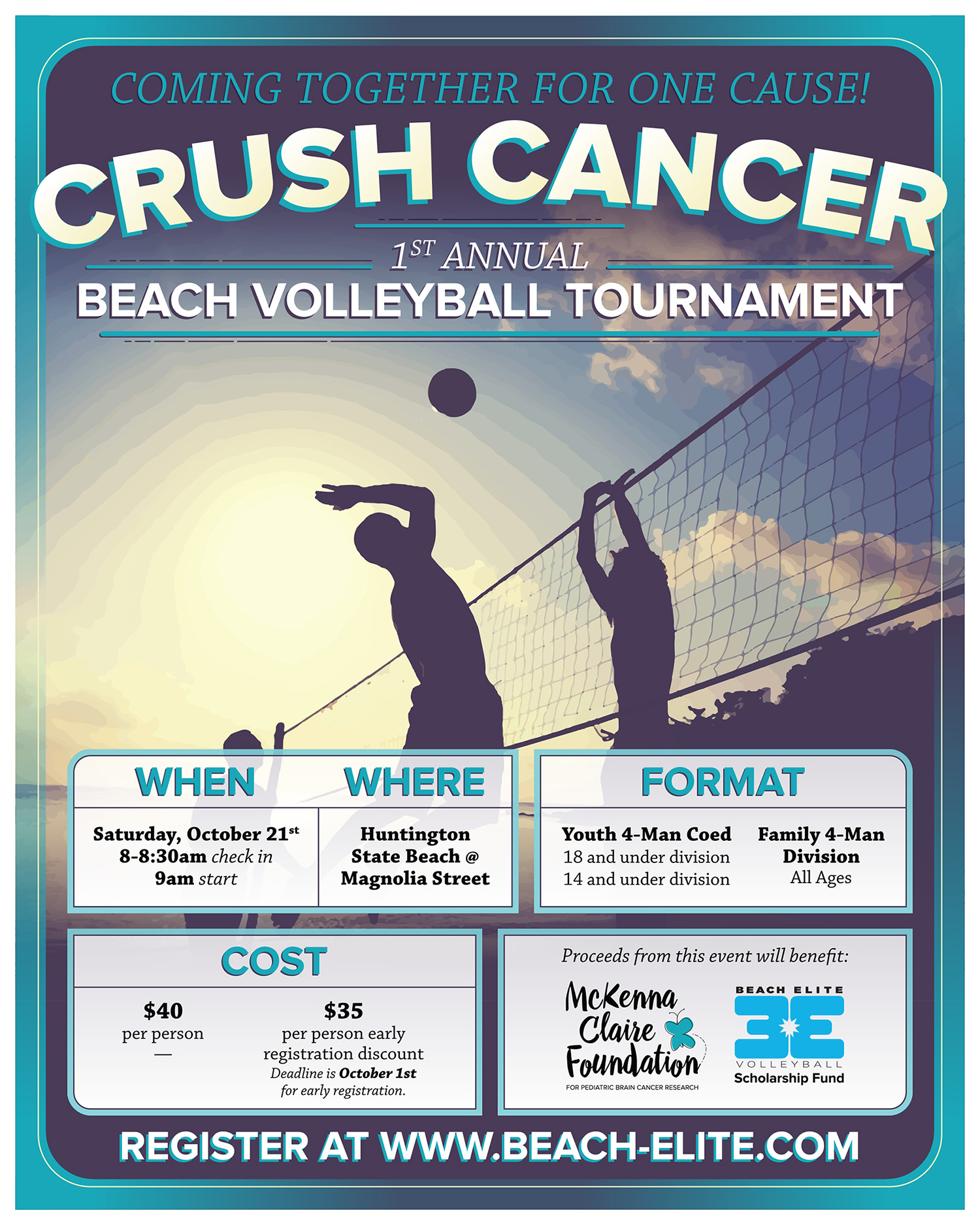 Join us in a fun 4-man coed tournament in Huntington Beach to raise money for the McKenna Claire Foundation for Pediatric Brain Cancer Research and the Beach Elite Youth Scholarship Fund! Proceeds to benefit brain cancer research and to scholarship local youth to play club volleyball. We will have food provided by Mama’s in HB, raffle, medals for top finishers, music and prizes. Check in is 8am-8:30am. Play starts at 9am. Tournament location is Huntington State Beach at Magnolia Street. We will have 10 courts and expect to sell out so please register early!